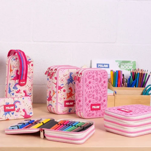 Organize your school day with impeccable style and quality with a complete set from Milan's special Flowicorn series! A model in a delicate beige pattern combines functional layout with a modern and fresh design. Compact yet highly functional, it comes fully equipped with high-quality Milan supplies, ready to use from day one.