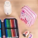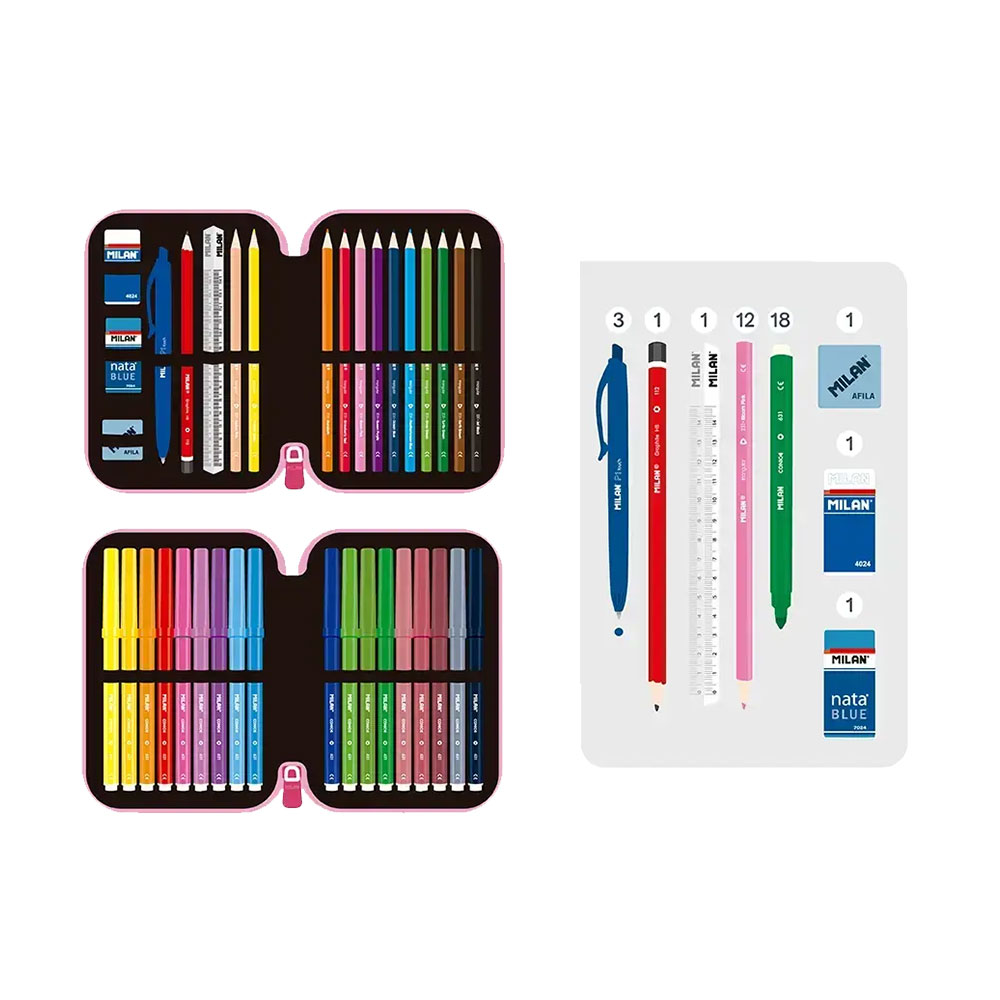 (18 felt-tip pens, 12 colored pencils, 1 HB pencil, 1 ballpoint pen, 1 ruler, 1 sharpener, 2 erasers)