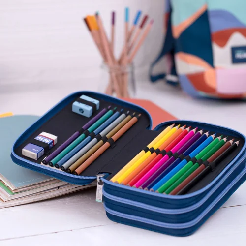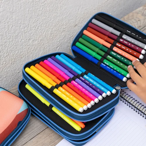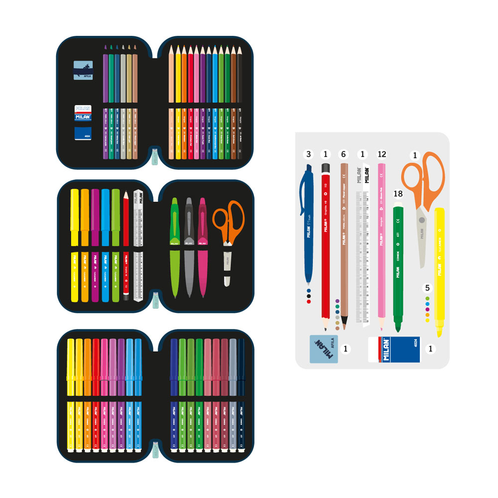 (18 felt-tip pens, 12 colored pencils, 1 HB pencil, 10 graphite pencils, 3 pens (black, green, red), 2 erasers, 1 sharpener, 1 ruler, 1 scissors)