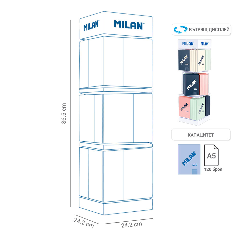 The ideal solution for organizing Milan notebooks, placing them directly in front of the customer in an aesthetic and orderly way.