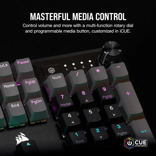 - RGB customization: Per-key backlighting, programmable macros, and key remapping via iCUE software.