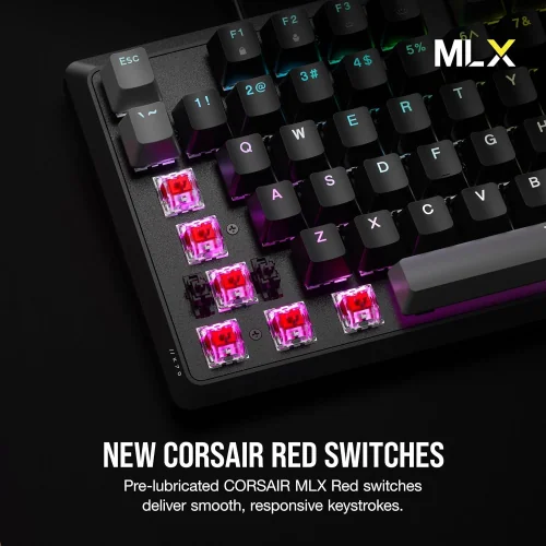 - Switches: Pre-lubricated CORSAIR MLX Red linear switches for fast, quiet operation.